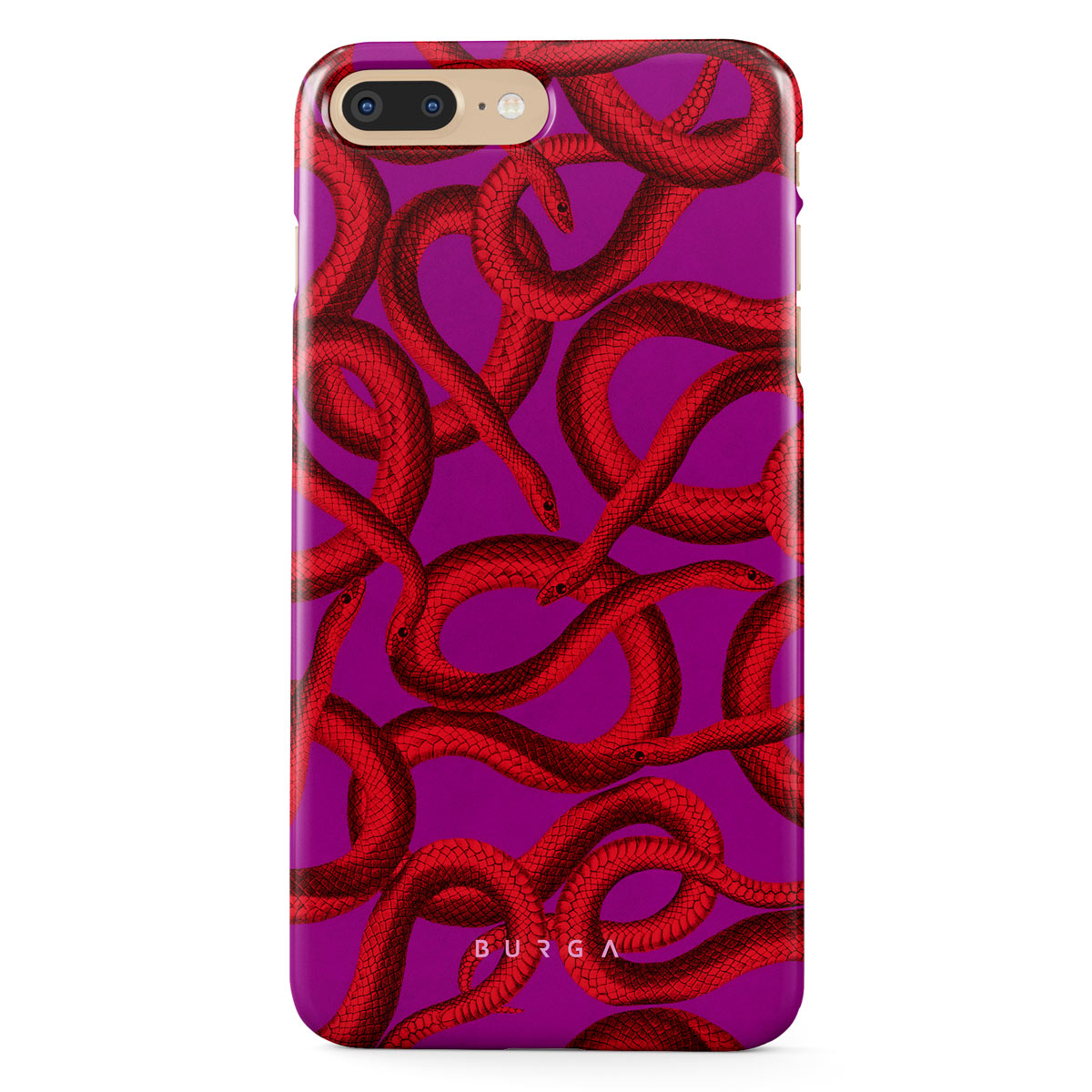 Watch Out iPhone 7 Plus 8 Plus phone case design offers a fierce feel with a bright magenta colored background covered in red snakes pattern. Make a statement while protecting your phone, as this case is guaranteed to catch everyone's eye.