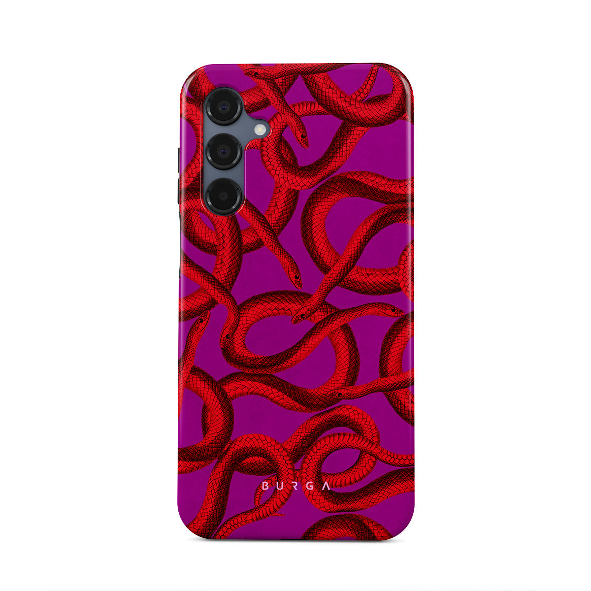 Watch Out Samsung Galaxy A16 phone case design offers a fierce feel with a bright magenta colored background covered in red snakes pattern. Make a statement while protecting your phone, as this case is guaranteed to catch everyone's eye.