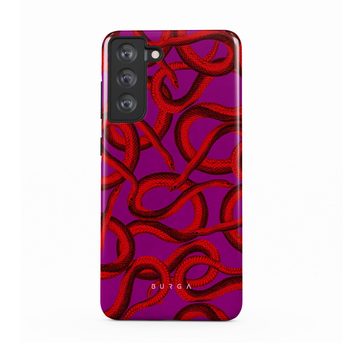 Watch Out Samsung Galaxy S21 FE phone case design offers a fierce feel with a bright magenta colored background covered in red snakes pattern. Make a statement while protecting your phone, as this case is guaranteed to catch everyone's eye.