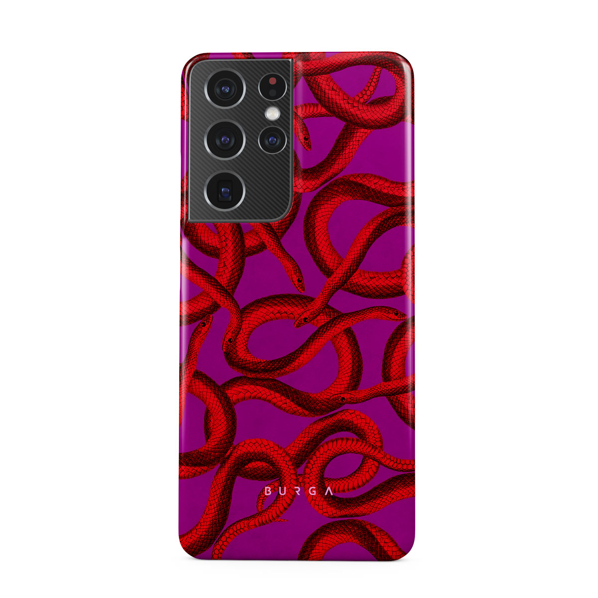 Watch Out Samsung Galaxy S21 Ultra phone case design offers a fierce feel with a bright magenta colored background covered in red snakes pattern. Make a statement while protecting your phone, as this case is guaranteed to catch everyone's eye.