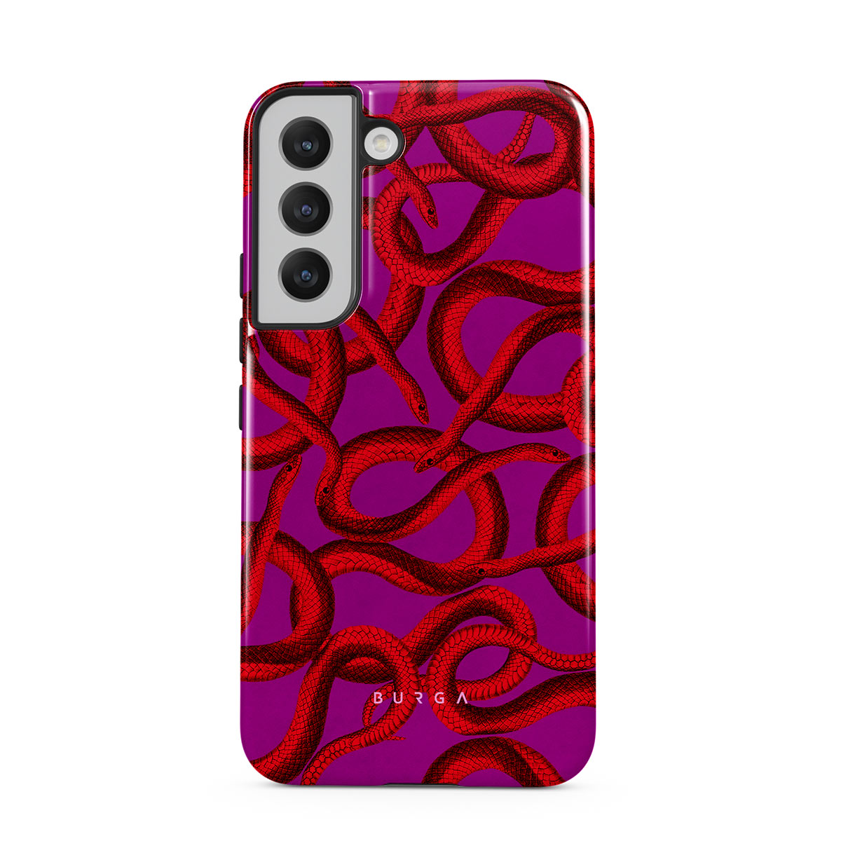 Watch Out Samsung Galaxy S22 phone case design offers a fierce feel with a bright magenta colored background covered in red snakes pattern. Make a statement while protecting your phone, as this case is guaranteed to catch everyone's eye.