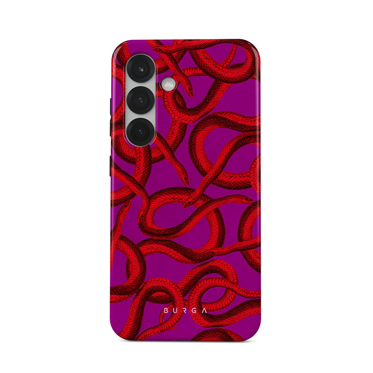 Watch Out Samsung Galaxy S25 Plus phone case design offers a fierce feel with a bright magenta colored background covered in red snakes pattern. Make a statement while protecting your phone, as this case is guaranteed to catch everyone's eye.