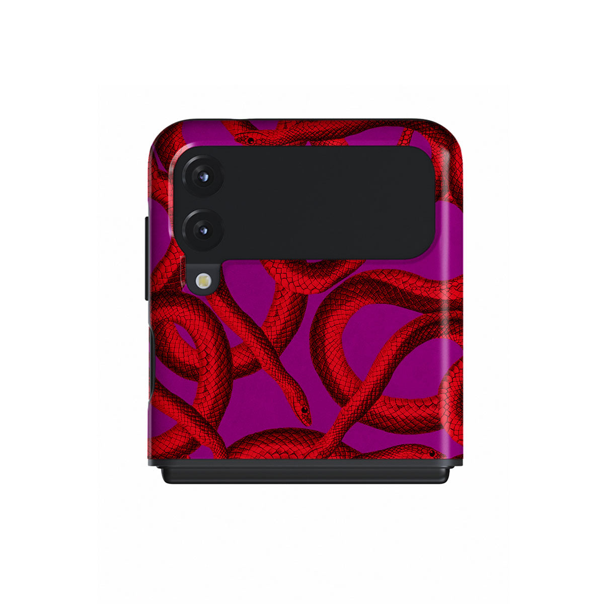 Watch Out Samsung Galaxy Z Flip 3 phone case design offers a fierce feel with a bright magenta colored background covered in red snakes pattern. Make a statement while protecting your phone, as this case is guaranteed to catch everyone's eye.