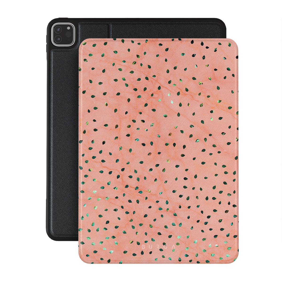The Watermelon Shake iPad Pro 11 (4th/3rd Gen) folio case offers a playful take on design merging. The watermelon seed-like specks showcase striking tropical design fragments that add a splash of color to the fresh and breezy coral pink marble. This way, the funny protective iPad cover becomes a perfect statement piece for your summer outfits.