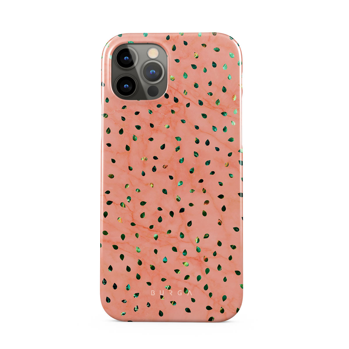 The Watermelon Shake iPhone 12 Pro Max phone case offers a playful take on design merging. The watermelon seed-like specks showcase striking tropical design fragments that add a splash of color to the fresh and breezy coral pink marble. This way, the funny protective phone cover becomes a perfect statement piece for your summer outfits.