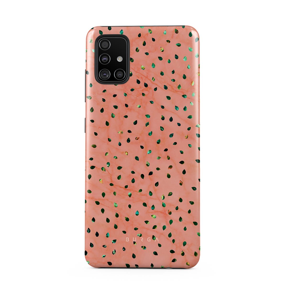 The Watermelon Shake Samsung Galaxy A51 phone case offers a playful take on design merging. The watermelon seed-like specks showcase striking tropical design fragments that add a splash of color to the fresh and breezy coral pink marble. This way, the funny protective phone cover becomes a perfect statement piece for your summer outfits.