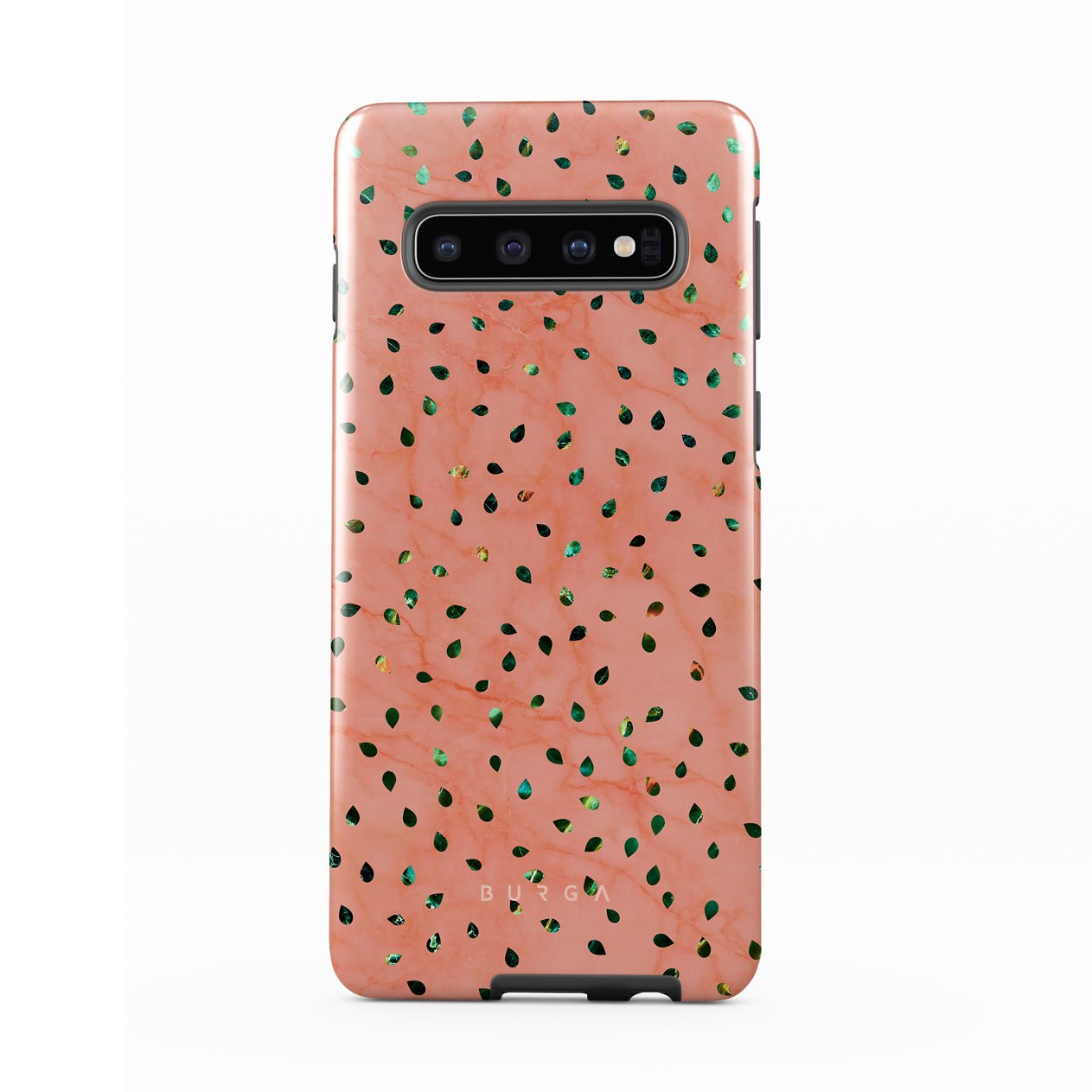 The Watermelon Shake Samsung Galaxy S10 phone case offers a playful take on design merging. The watermelon seed-like specks showcase striking tropical design fragments that add a splash of color to the fresh and breezy coral pink marble. This way, the funny protective phone cover becomes a perfect statement piece for your summer outfits.
