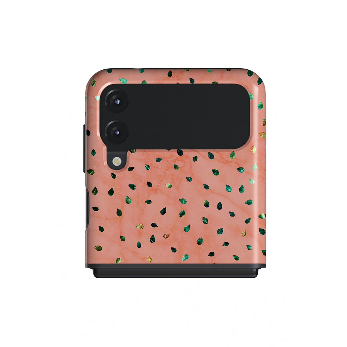 The Watermelon Shake Samsung Galaxy Z Flip 3 phone case offers a playful take on design merging. The watermelon seed-like specks showcase striking tropical design fragments that add a splash of color to the fresh and breezy coral pink marble. This way, the funny protective phone cover becomes a perfect statement piece for your summer outfits.