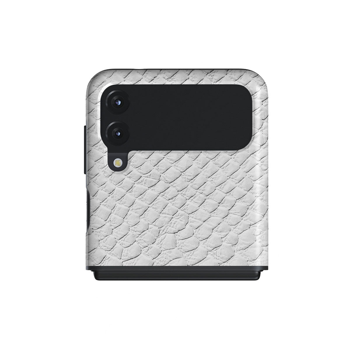 Glacial Desert Samsung Galaxy Z Flip 3 phone case features snakeskin design in glacial white color. The dangerous animal print will add confidence and a touch of luxury to your style while transforming your phone into a fashion accessory.
