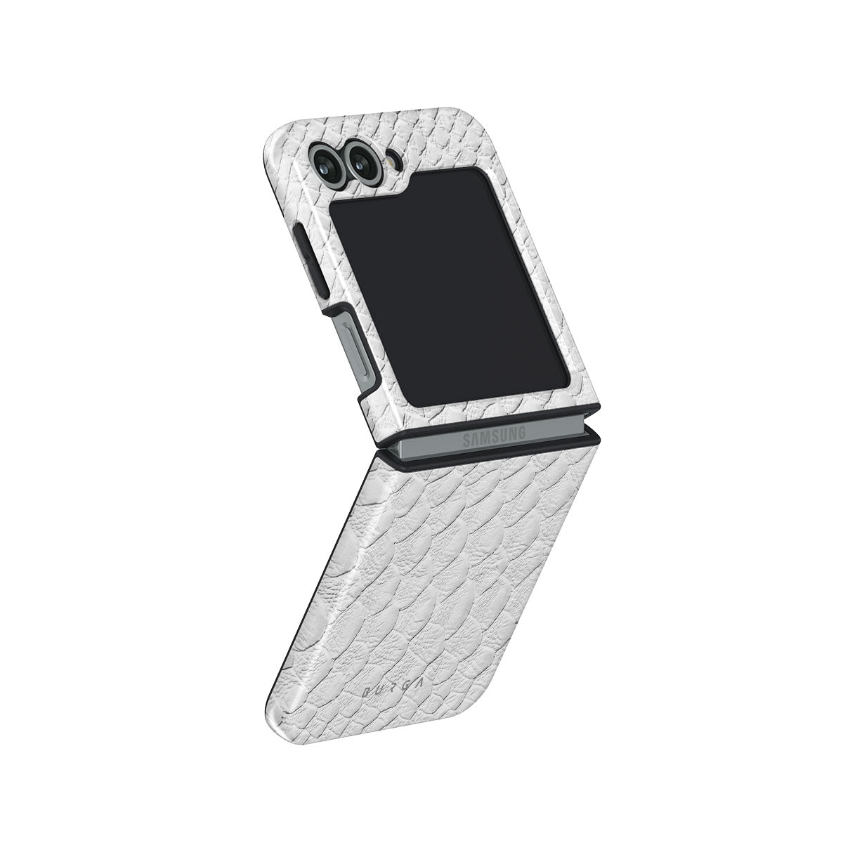 Glacial Desert Samsung Galaxy Z Flip 6 phone case features snakeskin design in glacial white color. The dangerous animal print will add confidence and a touch of luxury to your style while transforming your phone into a fashion accessory.